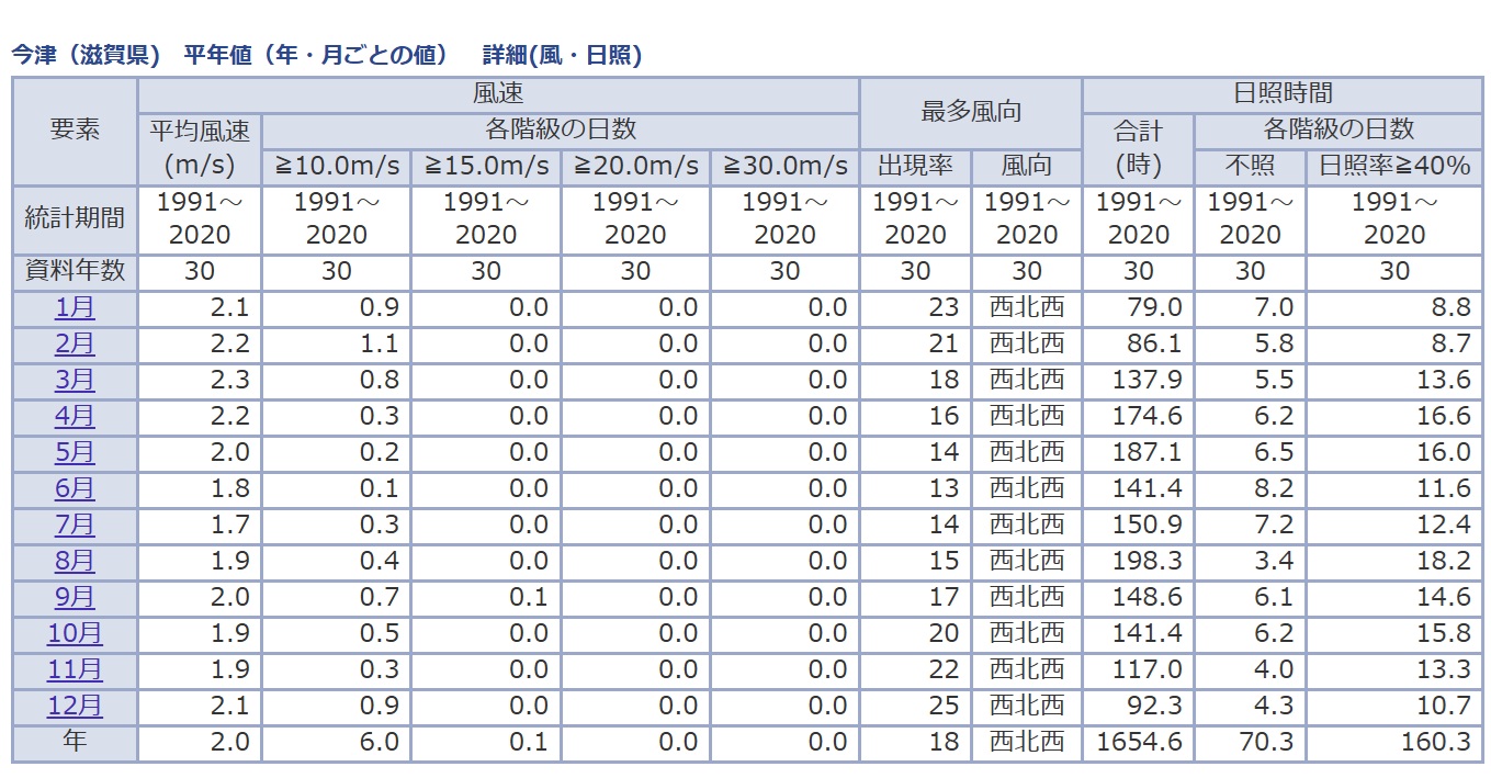 今津地域気象観測所における1991〜2020年の30年間の最多風向(気象庁のホームページより)